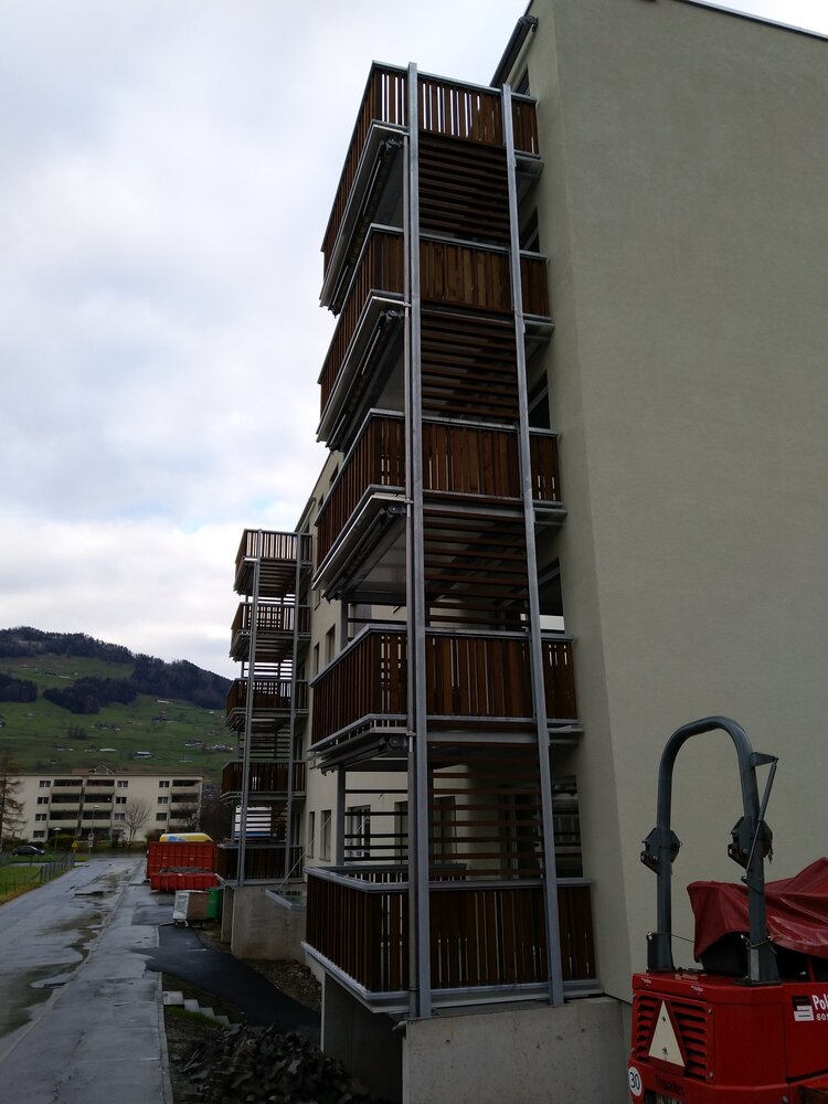 5-stöckige, gestützte Balkonanlage, Oberfläche feuerverzinkt, Balkonboden Inopan, inkl. Geländer aus feuerverzinktem Stahlrohr und Abkantwinkel mit Füllelement Holz