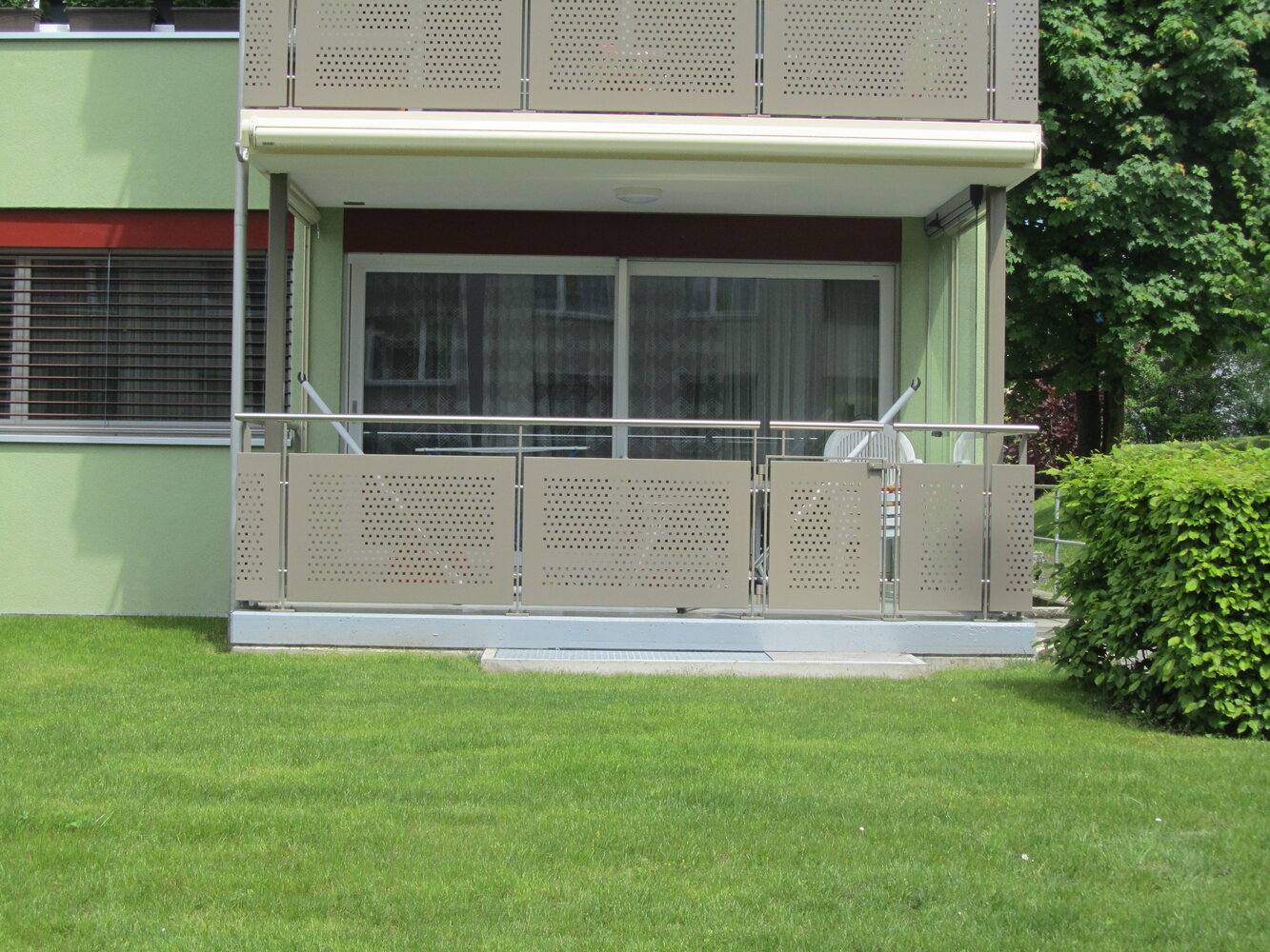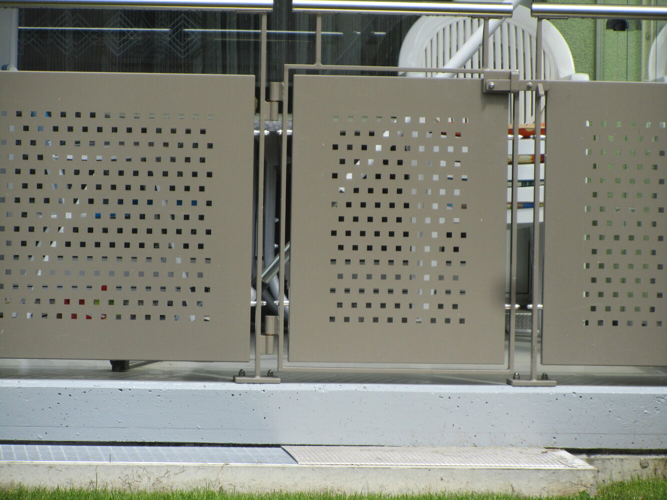 Lochblechgeländer bestehend aus Pfosten FLA 40/10mm auf Betonboden montiert, Oberfläche feuerverzinkt und pulverbeschichtet, Handlauf CNS Ø42.4mm geschliffen, Blechfüllung Aluminium 2mm 4fach abgekantet mit quadratischer Lochstanzung, Oberfläche pulverbeschichtet, Farbe RAL 7036