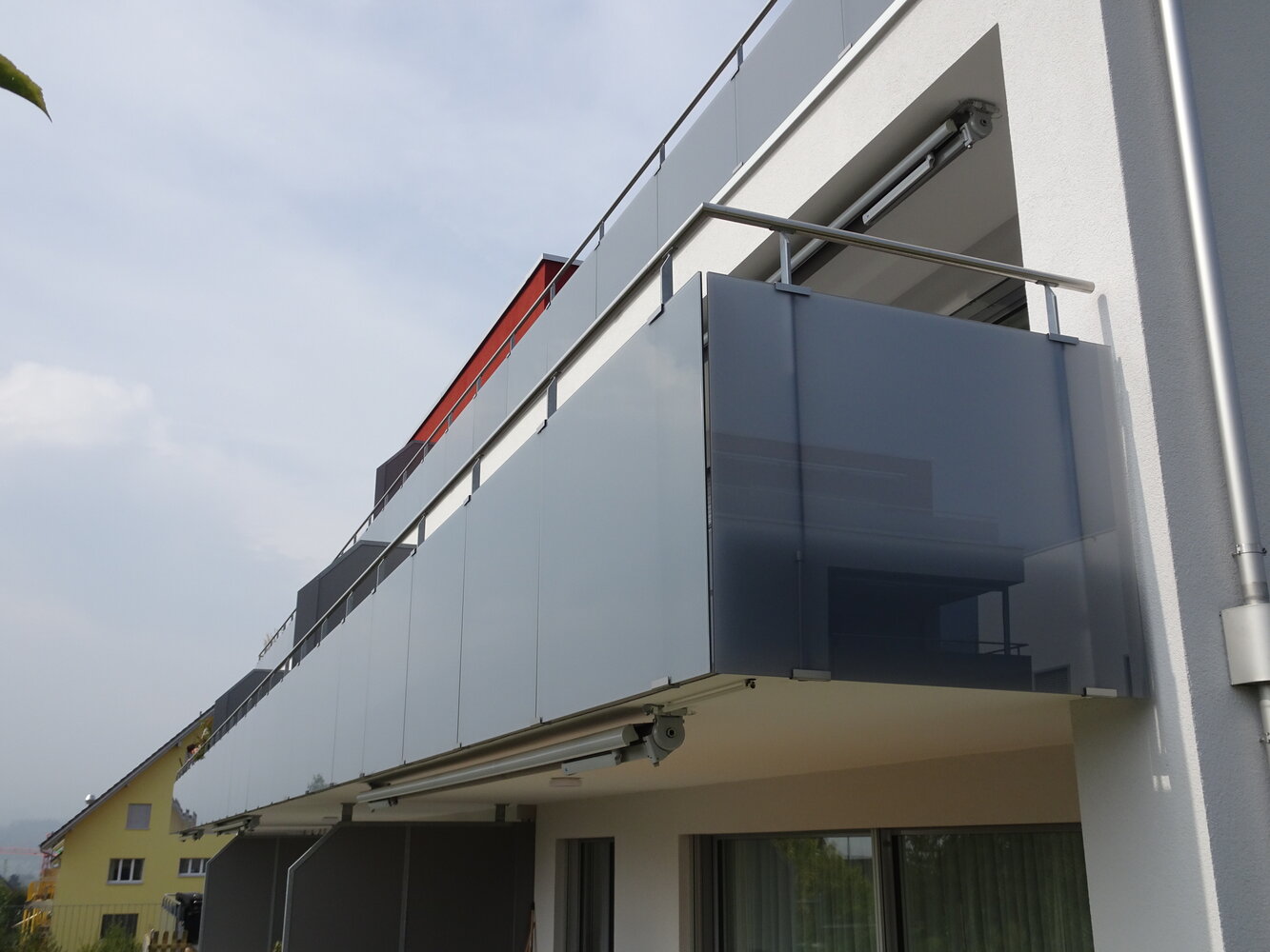 Glasgeländer bestehend aus rechteckigen Stahlpfosten 40/10mm, Handlauf aus geschliffenem CNS-Rohr Ø 42.4mm, Füllung aus VSG (Verbundsicherheitsglas) 2x6mm mit Matt- und Graufolie zur Farbgebung.