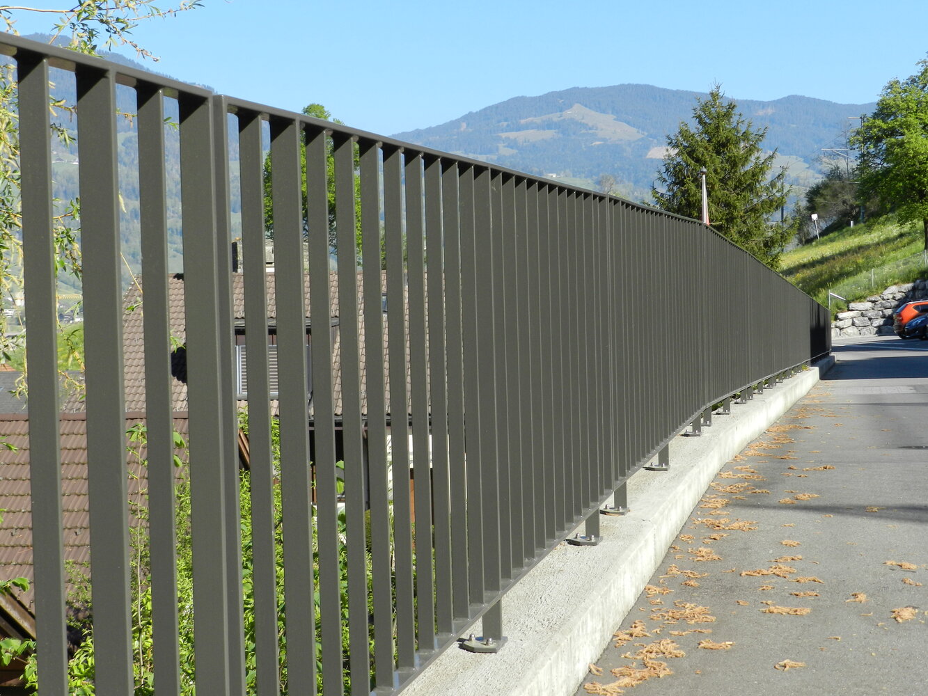 Staketengeländer bestehend aus Pfosten Flachstahl 40/10 mm mittels Fussplatte auf Betonbrüstung befestigt, Ober- und Untergurt Flachstahl 40/10 mm, Staketen 30/8 mm, Oberfläche feuerverzinkt und pulverbeschichtet (RAL 7016).