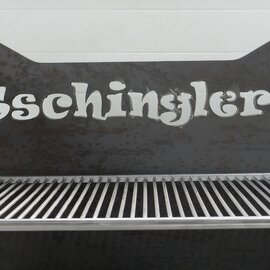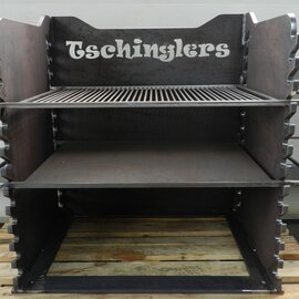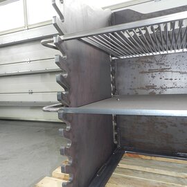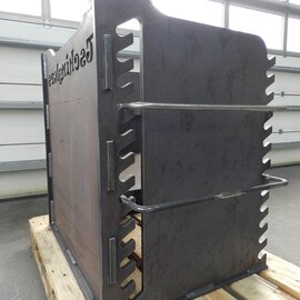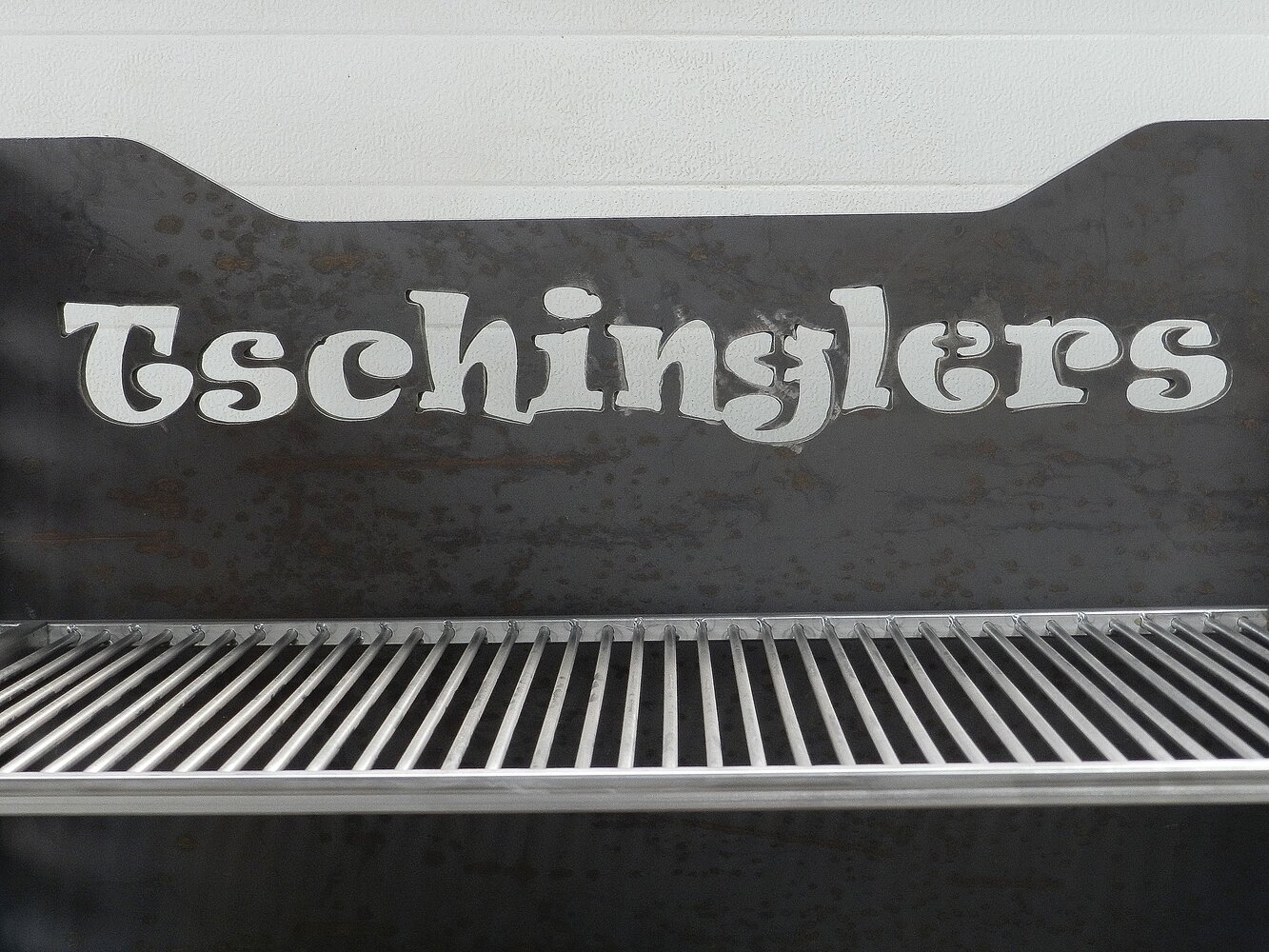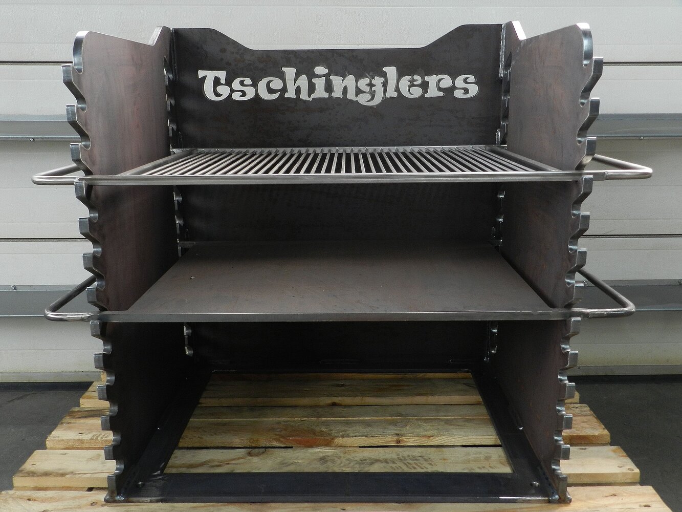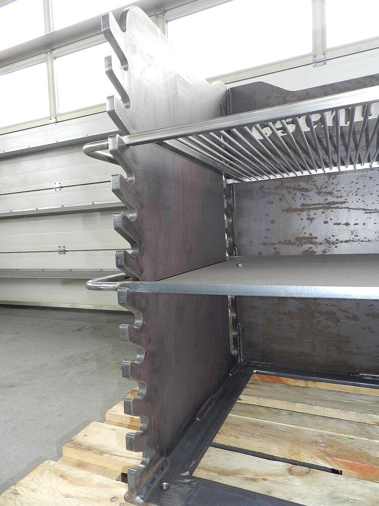Das Grundgerüst des Grills wird aus gelaserten 15 mm dicken Stahlblechen gefertigt. Diese Bleche können nach Wunsch mit einer beliebigen Gravur versehen werden.