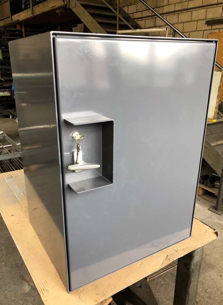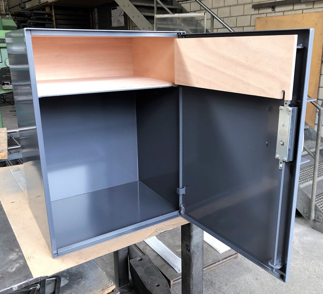 Der Sprengmittelbehälter wird aus gekantetem Stahlblech, Oberfläche pulverbeschichtet, hergestellt. Enthalten ist ein separates Zünderfach aus Holz sowie ein Schliessmechanismus inkl. KABA-Schloss.